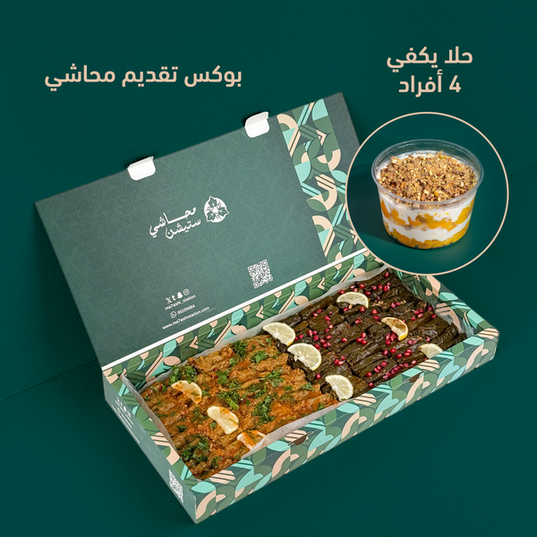 الرئيسيةبوكس تقديم + حلا من اختياركبوكس تقديم + حلا من اختياركالوصفبوكس فاخر للزوارات والمناسبات، يجمع 96 قطعة من ألذ المحاشي، مع حلا من اختياركبوكس التقديم * ورق عنبملفوف (مكس ( ورق عنب + ملفوفاختيار من الحلويات المبردة * كاسترد بسكويت الحجم العادي - يكفى 4 أفراد ترافيل الأوريو الحجم العادي - يكفى 4 أفراد ترافيل المانجو الحجم العادي - يكفى 4 أفرادسلطة فواكة الحجم العادي - يكفي 4 اشخاصحلوي إلبه التقليديةالنكهاتنكهة الليموننكهة دبس الرمان النكهة الحارة مكس الليمون مع دبس الرمانمكس اليمون مع الحارمكس دبس الرمان والفلفل الحار